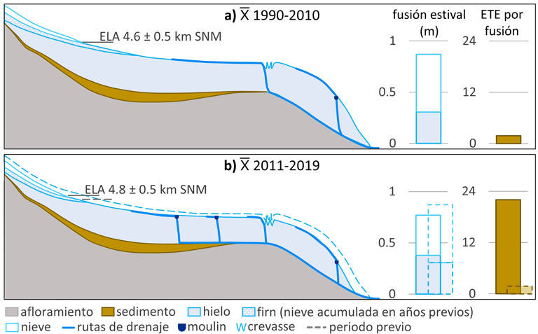 Durante las últimas décadas el aumento de la temperatura y las bajas precipitaciones han reducido la cobertura de nieve sobre los glaciares, por lo que el hielo glaciar ha estado expuesto por más tiempo a la atmósfera, la que, a su vez, es cada vez más cálida (Malmros et al. 2018). En base a estas observaciones, se hipotetiza que esta mayor exposición glaciar a la atmosfera provocó un incremento de la circulación de agua líquida y sus morfologías asociadas (molinos glaciares, canales supraglaciales y subglaciales), lo que eventualmente conectó piscinas de sedimento subglacial que antes no estaban disponibles (Figura 5). Si bien un reciente modelo físico de índole teórico sugirió que una pérdida sostenida de volumen glaciar podría conllevar un aumento dramático del caudal sólido fluvial de los glaciares “alpinos” o de “montaña” (Delaney & Adhikari 2020), esta sería la primera vez donde se constata con datos dicha teoría. Hipótesis alternativas fueron evaluadas por Vergara, Garreaud & Ayala (2022), pero descartadas al contrastarlas con las observaciones.