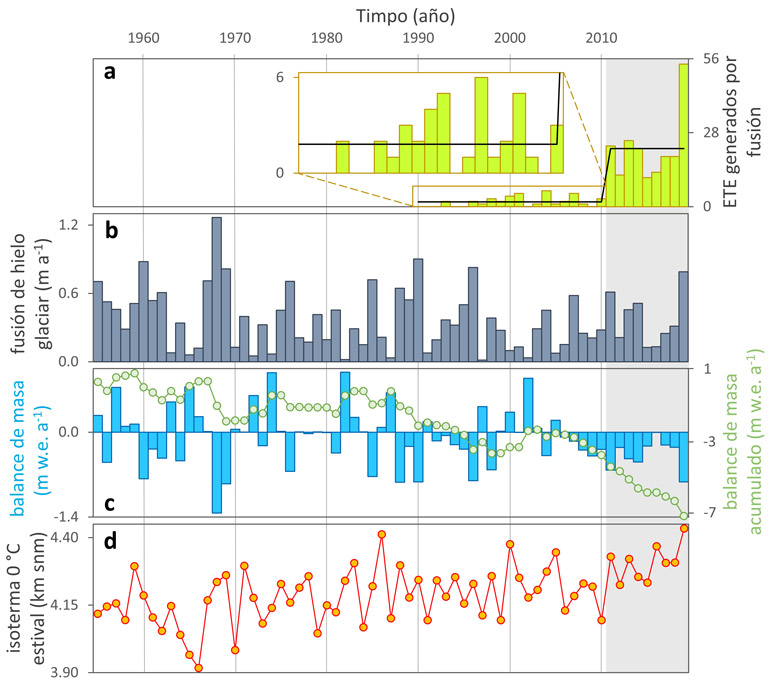 La Figura 4 ilustra la variación del volumen de los glaciares de la cuenca del río Maipo durante las últimas décadas, donde se aprecian varios rasgos relevantes. Hay una tendencia multidecadal de pérdida del volumen glaciar, incluyendo una secuencia ininterrumpida de años con balance de masa negativo que comenzó cinco años antes del salto de los ETE. El año 2011 el balance de masa fue negativo, pero no extraordinario, y desde este año en adelante no volvió a ocurrir un año de balance de masa positivo. Esto sugiere que el salto de los ETE se debió a una configuración hidroglaciológica de lenta evolución que alcanzó un nuevo estado en el año 2011, a raíz de un deshielo anómalo.