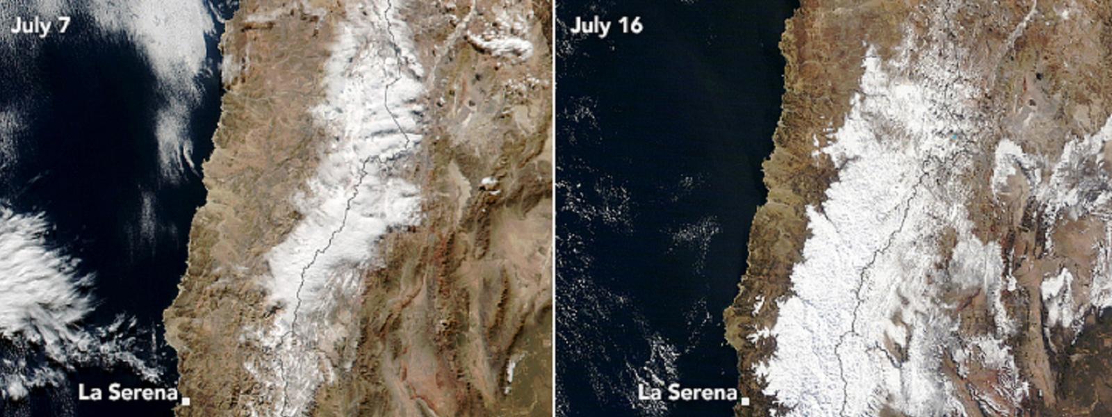 En la publicación titulada “Manto de nieve para Los Andes”, se comenta el aumento en la capa de nieve de la cordillera de Los Andes en el norte y el centro del país, sobre la base de dos imágenes satelitales. En la primera, captada el 7 de julio (a la izquierda), se aprecia una delgada capa de nieve. En la segunda, registrada del 16 de julio (a la derecha), se observa una abundante cantidad de nieve recién caída como consecuencia del paso de dos sistemas meteorológicos ocurridos entre el 9 y el 10 de julio y entre el 14 y el 15 de julio, respectivamente.
